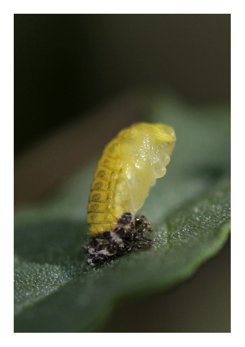 Voilà une position insolite pour une nymphe qui est immobile la plupart des 10 jours qu'elle passe sur sa feille!