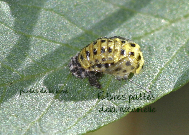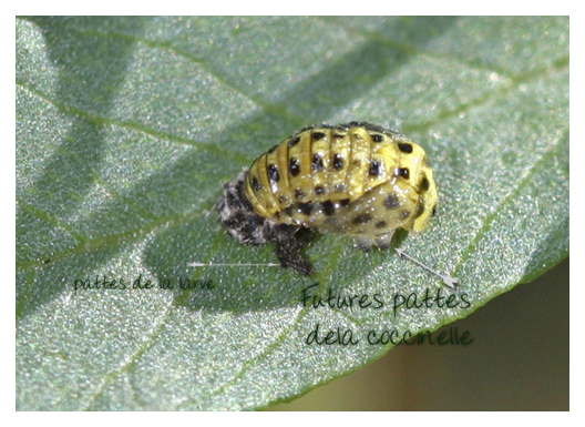 A ce stade de la transformation, il est intéressant d'observer les restes de la larve( ses pattes et son enveloppe poilue) et le début des attributs de l'insecte adulte.On observe ainsi l'ébauche des futures pattes de la coccinelle.